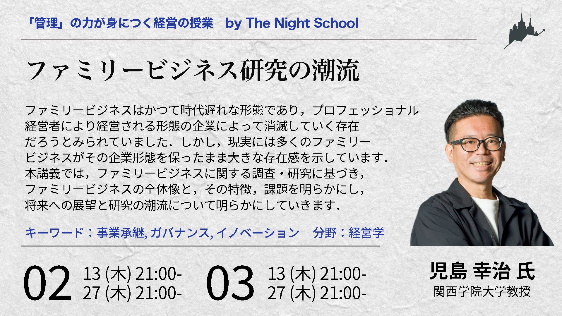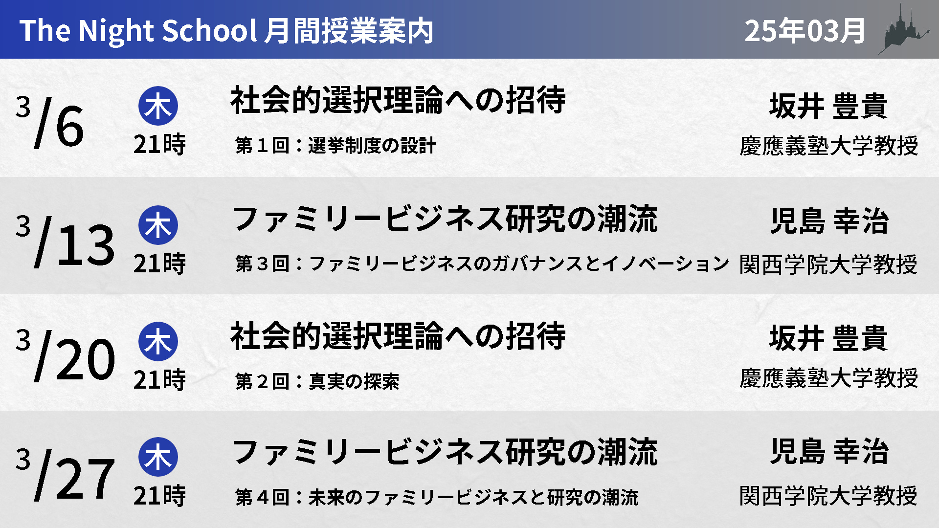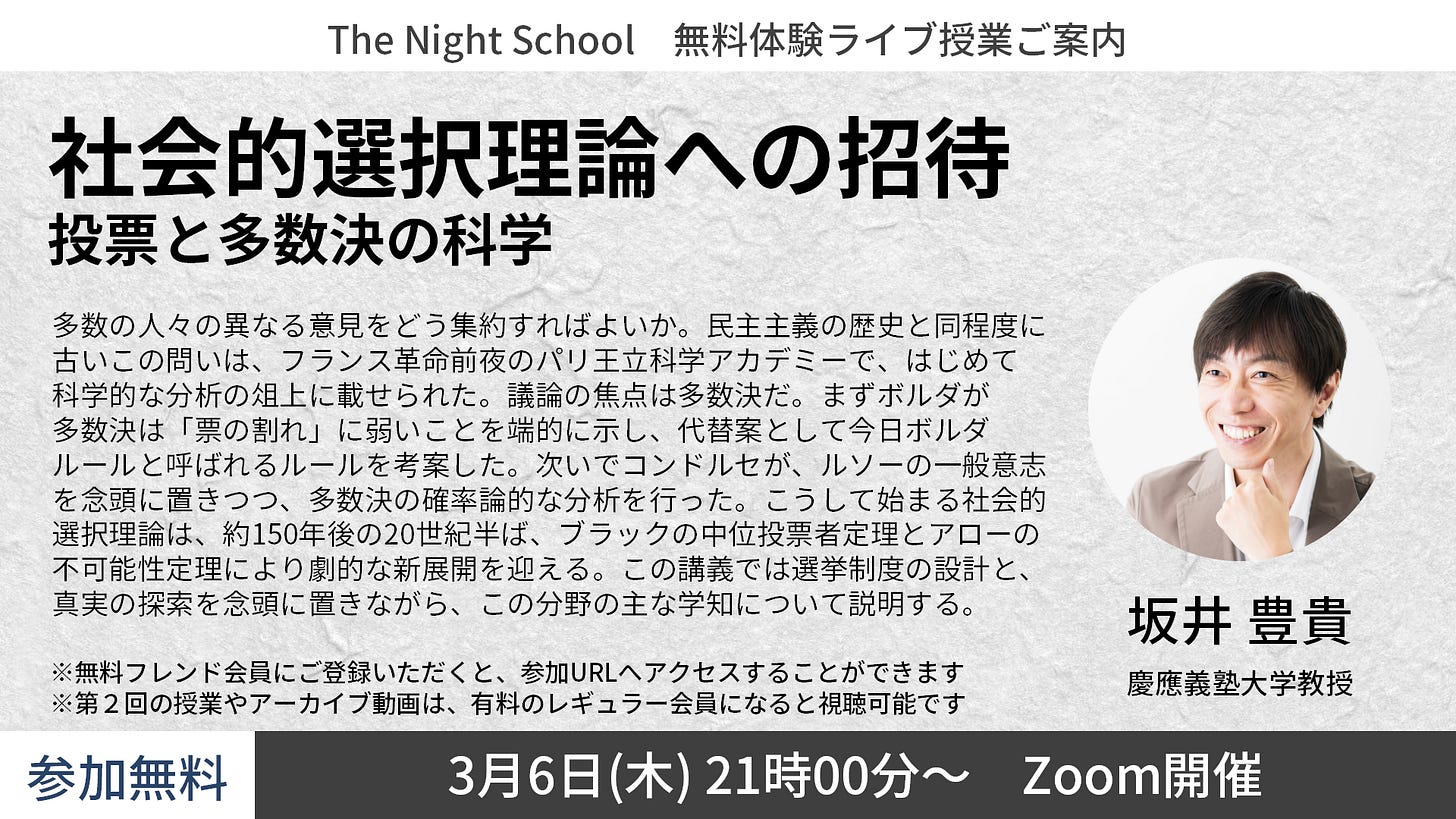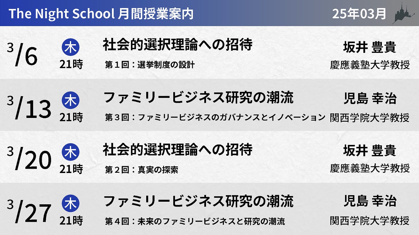 3月は、慶應義塾教授・坂井豊貴さんによる「社会的選択理論への招待:投票と多数決の科学(坂井豊貴)」の授業2回と、関西学院大学教授・児島幸治さんによる「ファミリービジネス研究の潮流」の授業2回になります。
