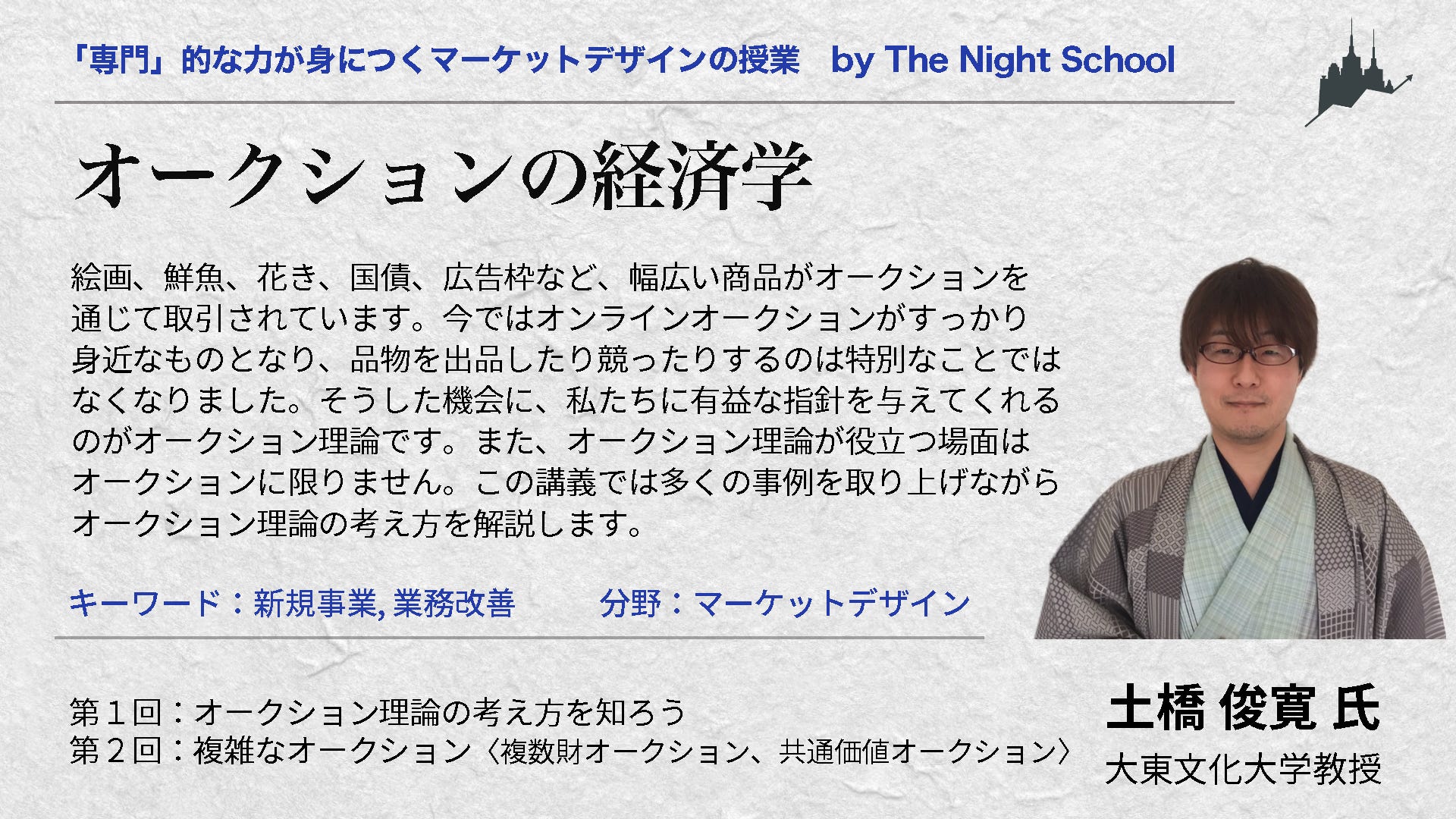 絵画、鮮魚、花き、国債、広告枠など、幅広い商品がオークションを通じて取引されています。今ではオンラインオークションがすっかり身近なものとなり、品物を出品したり競ったりするのは特別なことではなくなりました。そうした機会に、私たちに有益な指針を与えてくれるのがオークション理論です。また、オークション理論が役立つ場面はオークションに限りません。この講義では多くの事例を取り上げながらオークション理論の考え方を解説します。