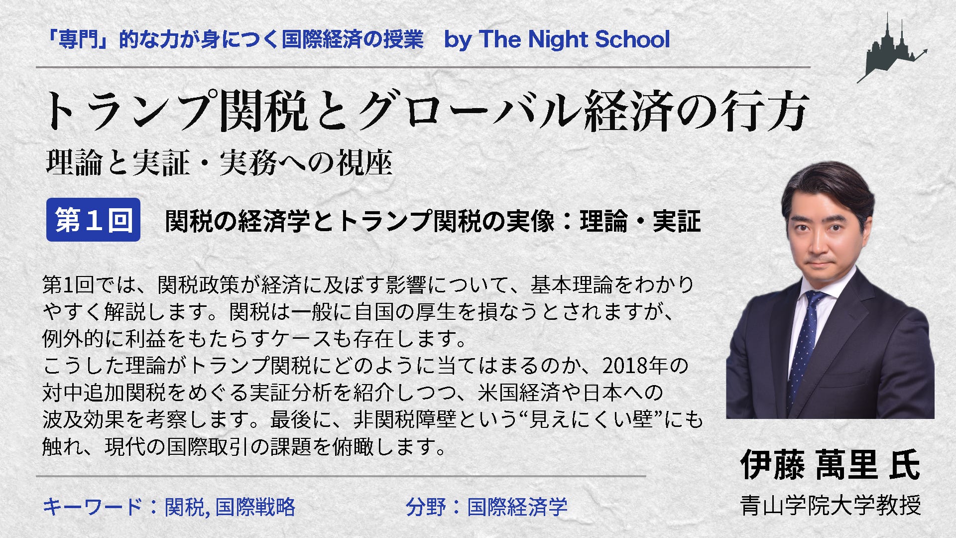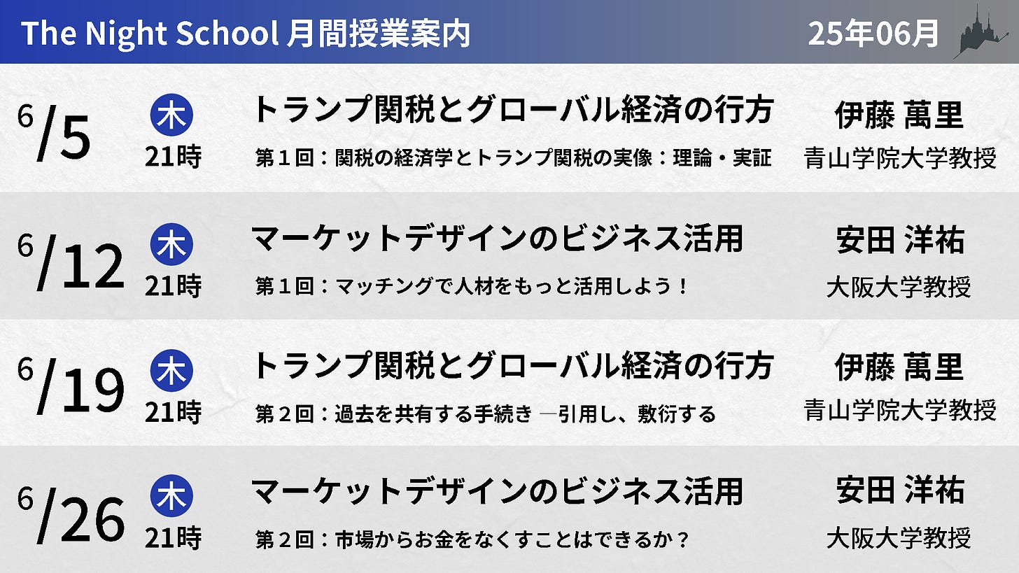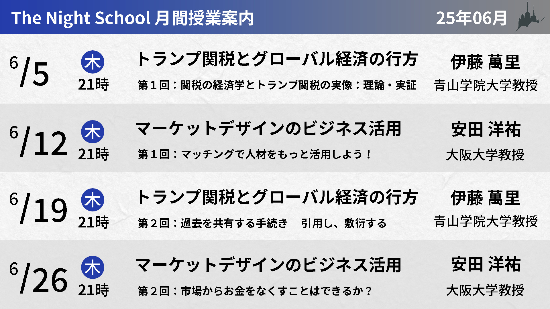 6月は、青山学院大学教授・伊藤萬里さんによる「トランプ関税とグローバル経済の行方:理論と実証・実務への視座」の授業2回と、大阪大学教授・安田洋祐さんによる「マーケットデザインのビジネス活用」の授業2回になります。