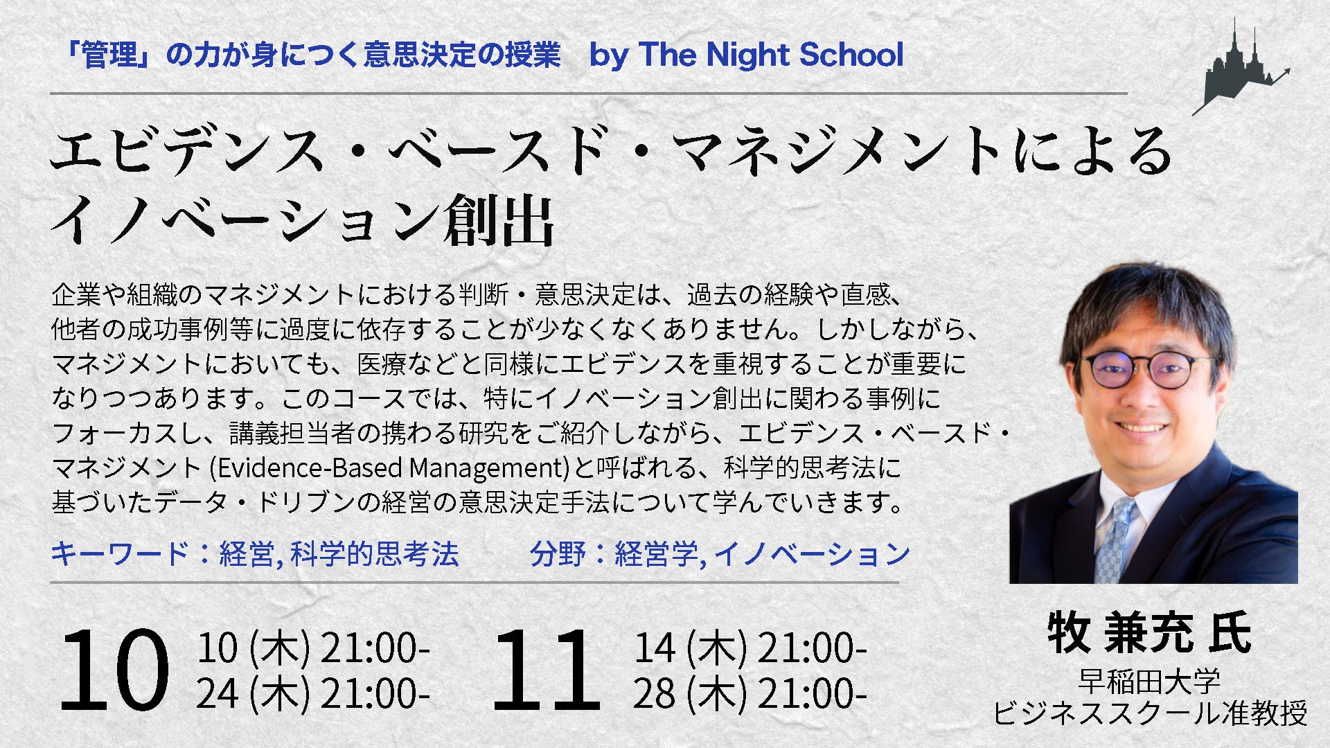 企業や組織のマネジメントにおける判断・意思決定は、過去の経験や直感、他者の成功事例等に過度に依存することが少なくなくありません。しかしながら、マネジメントにおいても、医療などと同様にエビデンスを重視することが重要になりつつあります。このコースでは、特にイノベーション創出に関わる事例にフォーカスし、講義担当者の携わる研究をご紹介しながら、エビデンス・ベースド・マネジメント (Evidence-Based Management)と呼ばれる、科学的思考法に基づいたデータ・ドリブンの経営の意思決定手法について学んでいきます。