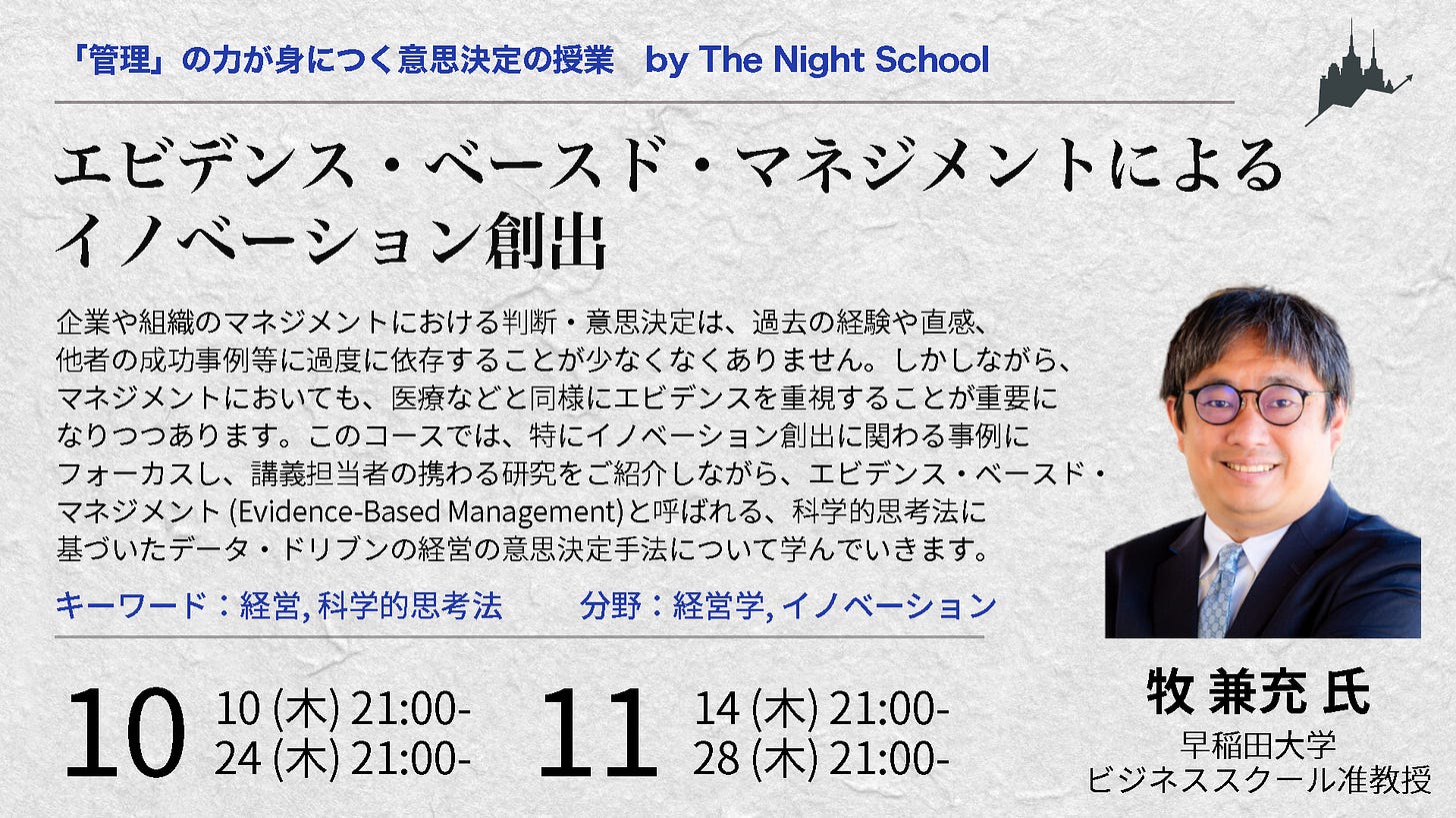 イベントサービスPeatixにて、「エビデンス・ベースド・マネジメントによるイノベーション創出(牧兼充)」の授業視聴権(第1, 2回目のアーカイブ視聴+第1~4回目のライブ視聴)を販売いたします。