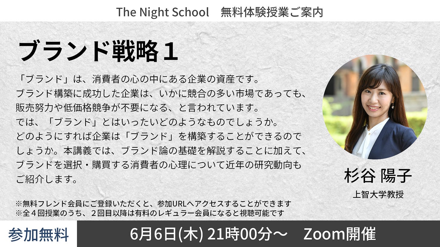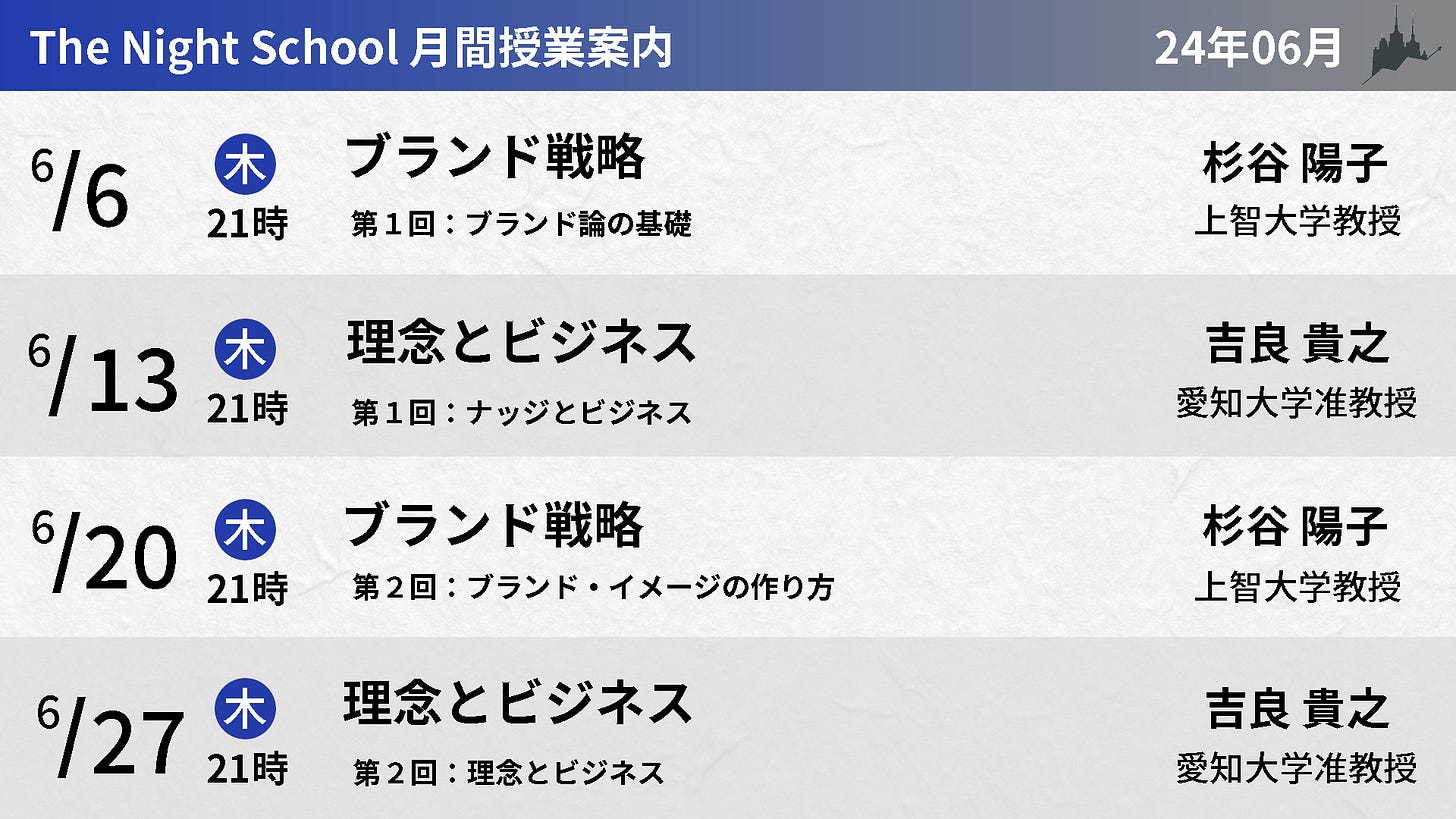 6月は、上智大学経済学部教授・杉谷陽子さんによる「ブランド戦略」の授業2回と、愛知大学准教授・吉良貴之さんによる「理念とビジネス」の授業2回となります。