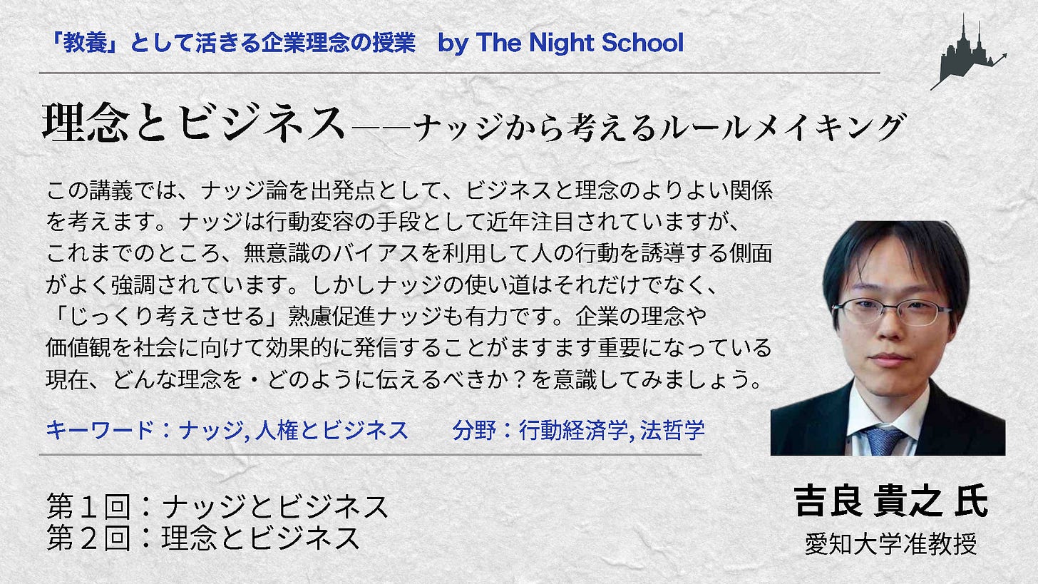この講義では、ナッジ論を出発点として、ビジネスと理念のよりよい関係を考えます。ナッジは行動変容の手段として近年注目されていますが、これまでのところ、無意識のバイアスを利用して人の行動を誘導する側面がよく強調されています。しかしナッジの使い道はそれだけでなく、「じっくり考えさせる」熟慮促進ナッジも有力です。企業の理念や価値観を社会に向けて効果的に発信することがますます重要になっている現在、どんな理念を・どのように伝えるべきか?を意識してみましょう。