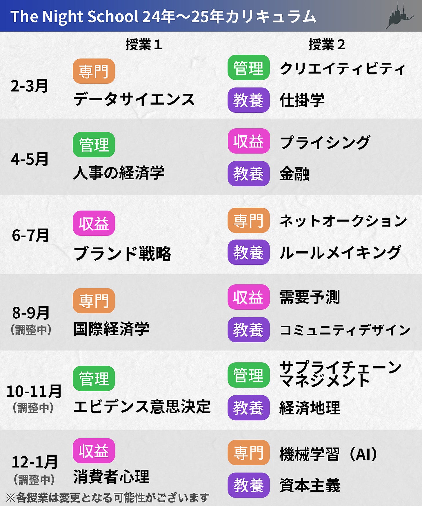 年間を通して、ビジネスに使える知識を体系的に学べるようにカリキュラムを組んでいます。幅広い分野に触れることで、課題解決力や経済学的な論理思考を効率よく身に着けることができます。